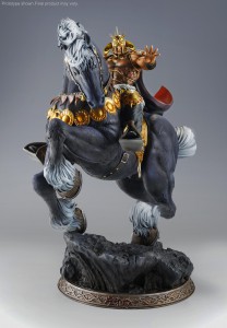 La pose est extrêmement dynamique et totalement fidèle au caractère imposant de Raoh. Ce dernier se tient sur son cheval, Kokuoh, le regard et la main gauche rivés sur celui qu'on imagine être son adversaire. Kokuoh se cabre sur un sol escarpé qui déborde littéralement du socle. L'effet de mouvement est renforcé par la queue du cheval et la cape du personnage.