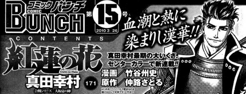 Takeya Syûji, le très sympathique dessinateur d'Astral Project (disponible aux éditions Casterman) et que nous avons eu le plaisir de rencontrer en 2007 lors de Japan Expo, vient de lancé une nouvelle série dans le Comic Bunch de cette semaine. Cette série d'aventure s'intitule "Guren no Hana - Sanada Yukimura".