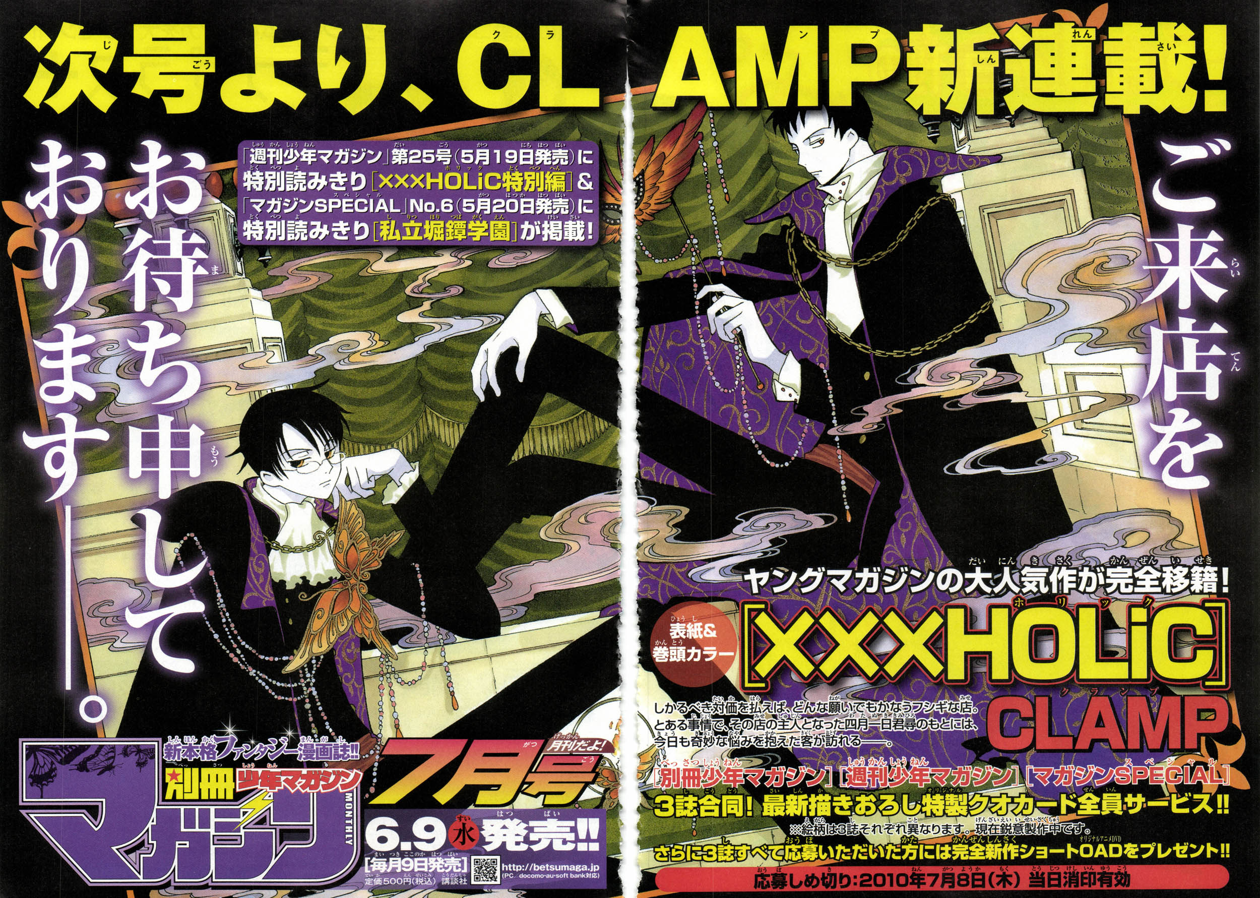 Les Clamp seront à l'honneur durant les mois de mai et de juin. Pour commencer, il y aura un chapitre spécial de Xxx Holic dans le Shônen Magazine #25, en vente le 19 mai. Ensuite on aura droit au 4ème chapitre de Shiritsu Horitsuba Gakuen (Cross Over comique ou on retrouve les personnages de Xxx Holic et de Tsubasa Reservoir Chronicle). Et enfin le 9 juin, ce sera la repris de Xxx Holic dans le Bessatsu Shônen Magazine #07. A cette occasion la série fera la couverture du magazine et aura droit à des pages couleurs. Le 18ème tome de Xxx Holic sortira au Japon au mois d'octobre, en France le 15ème tome, lui, sortira le 1er juillet chez Pika.
