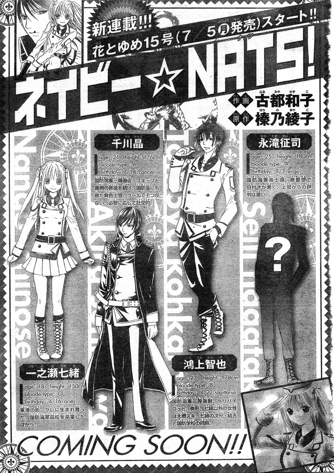 Furumiya Kazuko (Auteur de Bloody Kiss) va commencer un nouveau manga dans le Hana to Yume #15 (En vente le 5 juillet). Il s'intitulera Navy Nats! et sera scenarisé par Harino Ayako.