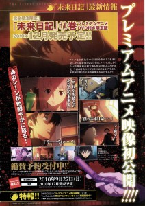 Prévu en septembre à l'origine, le 11ème tome de Mirai Nikki - Le Journal du Futur (Contenant un oad) sortira finalement en décembre. Cet oad contiendra un épisode pilot. Pour cet épisode le directeur sera Naoto Hosoda, le scénariste Katsuhiko Takayama et les chara-designers Eiji Hirayama et Ruriko Watanabe. Les réservations pour cette édition limitée sont ouvertes jusqu'au 27 septembre.