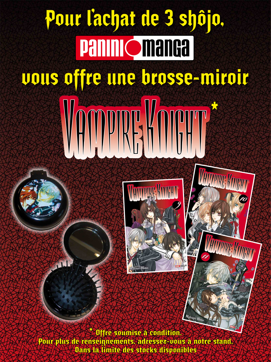 Vampire Knight, le shojo phare de l'éditeur, sera mis à l'honneur! En plus de la sortie du tome 11 dans une édition collector (lire la news), Panini vous offrira une brosse-miroir Vampire knight pour l'achat de trois shojos!