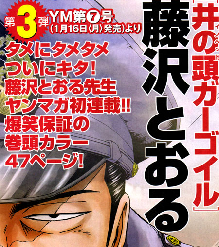 Comme nous vous l'annoncions le 5 décembre dernier, Tooru Fujisawa va débuter une nouvelle série dans le Young Magazine #07, en vente le 16 janvier prochain. Elle aura pour titre Ino Head no Gargoyle. L'histoire sera centrée autour d'un flic (Et d’après l'image, il y a peut être une chance que ce flic en question soit Saejima). Le 1er chapitre fera 47 pages et aura droit à des pages couleurs. C'est la 1ere fois que l'auteur publie une série dans ce magazine.