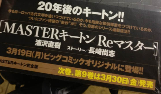 Celle-ci aura pour titre Master Keaton Remaster. Le chapitre est prévu dans le Big Comic Original qui sera en vente le 19 mars prochain. On ne sait pas encore si ce sera qu'une nouvelle ou alors une nouvelle série.