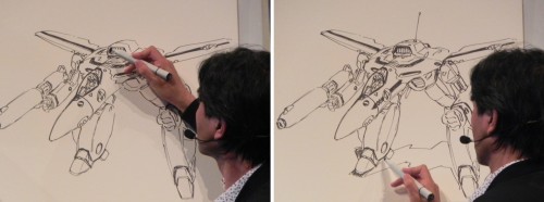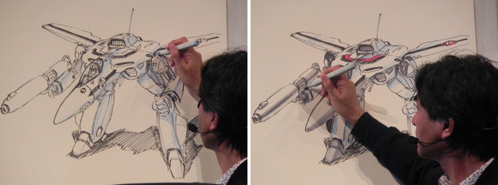 Sur la seconde partie de sa masterclass, Shôji Kawamori s'est lancé dans l'élaboration d'un dessin de la célèbre Valkyrie, et en couleurs ! Mais pour que l'ambiance ne retombe pas, et afin d'enrichir un peu plus ce long exposé, le réalisateur a convié l'audience à lui poser quelques questions en parallèle. Des questions de fan très pointues aux interrogations plus légères, voici un petit florilège de cet échange particulier :