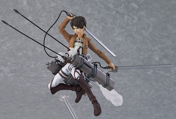 D'une taille d'environ 14,5cm, la Figma d'Eren sera fournie avec trois expressions (déterminé, en colère, et sous le choc), ainsi que ses deux épées, son équipement, et des effets de fumée permettant de reproduire au meux les scènes de combat. Sortie prévue pour mars 2014, au prix fabricant très précis de 4937 yen (37€).