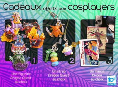 Les visiteurs cosplayés à l'effigie des personnages des séries de l'éditeur pourront avoir, au choix, des figurines des monstres de Dragon Quest – Emblem of Roto, des straps reprenant les créatures les plus craquantes de la saga, ou un manga Ki-oon.