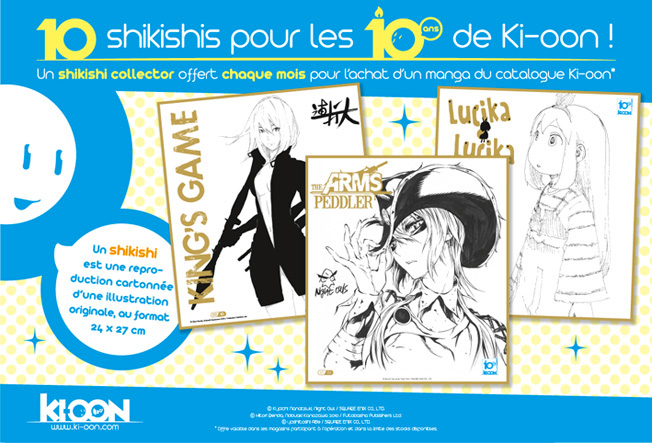 Pour fêter ses 10 ans, Ki-oon offre depuis plusieurs mois un shikishi pour tout achat d'un manga issu de leurs différentes collections. Une opération mensuelle qui s'est étalée tout au long de l'année.