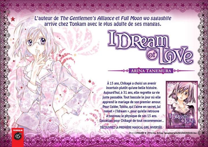 Arina Tanemura est décidément une auteure très prisée en France. Alors que son oeuvre de jeunesse Kamikaze Kaitô Jeanne est en cours de parution chez Glénat, celle à qui l'on doit aussi Full Moon, Princesse Sakura et The Gentlemen's Alliance Cross débarquera cette fois-ci aux éditions Tonkam avec sa dernière série en date, 31 I Dream, renommée en français I dream of love.