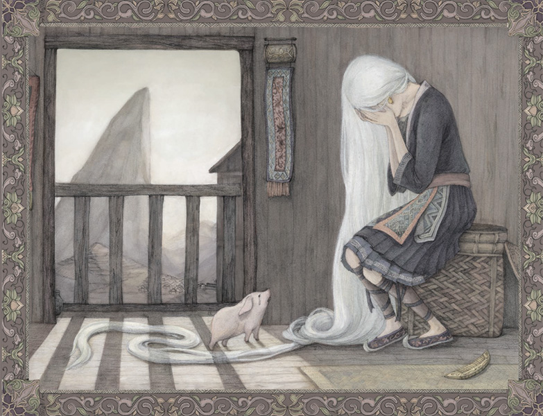 Au pied d’une montagne, se trouvait un petit village où habitait une très belle jeune fille. Elle avait de longs cheveux, aussi beaux qu’une cascade.