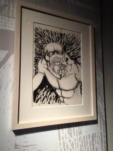 Suite à cette petite mise en bouche qui nous met bien à fond, la véritable exposition au sens propre commençait, avec en premier lieu un nombre FARAMINEUX de planches du manga. Je ne les ai pas compté bien sûr mais il devait sans doute y en avoir plus d'une centaine... Alors autant je trouve que le dessin de l'auteur n'est vraiment pas le plus beau que j'ai pu voir, autant lorsqu'on voit les dessins originaux cela a un tout autre impact et j'ai trouvé certaines planches encore plus excellentes par rapport à quand je les avais vu dans le manga. Ce qui était bien sympa aussi, c'est le fait que les planches ne soient pas juste affichées comme ça bêtement, il y avait toujours un grand décor autour en fonction des planches, je vous laisse juger par vous-même. L'auteur avait aussi fait un petit dessin pour l'exposition, mais manque de pot je ne comprends pas ce qu'il y a écrit, donc à ceux qui lisent le japonais ici je vous laisse traduire ça si l'envie vous prend !