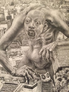 Après avoir admiré ces quelques planches, nous nous retrouvions dans une salle où étaient exposés les principaux premiers travaux de recherches de l'auteur avec notamment ses inspirations majeures. On pouvait donc voir qu'il avait fait pas mal de travaux d'esquisses pour trouver le design final des titans, qu'il s'était inspiré d'une oeuvre où justement il y avait plein de monstres, le jeu vidéo Muv-Luv Alternative. Un écran nous diffusait aussi une mini vidéo en accéléré où l'on voyait Hajime Isayama faire une planche de sa série.