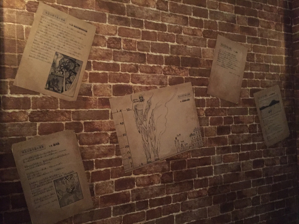Comme dit précédemment, on ne se foutait pas des visiteurs et les choses à voir étaient nombreuses, mais je vais vous décrire ce que j'ai pu voir comme dans le parcours que j'ai du suivre. Premièrement, après avoir donné son ticket et gravi quelques marches, on se retrouvait par petits groupes dans une genre de salle d'attente au style médiévale, soit avec des murs en vieilles briques, avec accrochées ça et là quelques affiches le temps de patienter avant d'entrer dans la prochaine salle. Les affiches semblaient être des reproductions d'articles d'étude sur les titans et les moyens de les vaincre, comme si cela venait d'un livre dans la série. Vous remarquerez le dessin assez connu comparant justement la taille de ces titans.