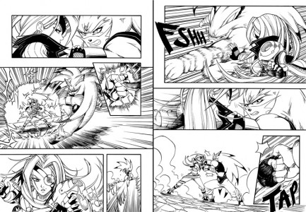 Parce qu'il est impossible de gérer la supervision artistique de jeu video et faire un manga en parallèle. J'avais besoin d'un coup de main d'une personne très talentueuse, et qui adhère à l'univers de Shiness. Je sais que Géo tient avant tout à ne pas dénaturer l'univers que je mets en place depuis si longtemps. J'imagine que ça ne doit pas être évident pour lui et je ne voudrais surtout pas brider sa créativité. C'est pour cela qu'on se prends parfois un moment pour revoir des expressions ou des textes, voir même créer des personnages exclusifs au manga ensemble. Grâce à lui, je peux me consacrer d'avantage à la narration à travers les story-boards que je lui fourni.