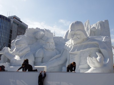 Parlons en justement de cette fête. Si celle-ci attire beaucoup de visiteurs, elle accueille surtout de nombreux artistes prêt à affirmer leur talent de sculpteur de neige ou de glace, ainsi tout le long du parc nous pouvons admirer plus d'une centaine de statues. C'est intéressant car si vous venez les premiers jours, vous pouvez admirer les artistes au travail en train de dessiner sur leur bloc de glace puis commencer à le sculpter petit à petit jusqu'au résultat final. Et autant vous dire que les résultats valent le déplacement. Le parc se découpe en plusieurs parties, la première est utilisée pour l'installation d'une gigantesque rampe où skieurs et snowboarders viennent concourir pour des compétitions de figures (impressionnant !), une autre partie est destinée à tout ce qui est concert (car oui, c'est aussi l'occasion pour de nombreux artistes de venir faire un concert tout frais), tandis que le reste est consacré aux statues. Celles de glace et de neige sont séparées, mais les plus importantes restent celles en neige, dont certaines sont carrément époustouflantes. Cette année, la statue majeure fut celle à l'effigie de Star Wars, que je vous laisse admirer dans les photos : merveilleux, c'est le mot !