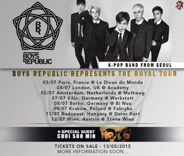 Le boy's band coréen Boys Republic a choisi la France pour débuter sa tournée européenne, intitulée The Royal Tour. Les cinqs jeunes hommes seront en effet présents au Divan du Monde (Paris 18ème) le vendredi 3 juillet, en pleine semaine de Japan Expo. Le pianiste Choi Soo-Min se produira en première partie de ce concert.