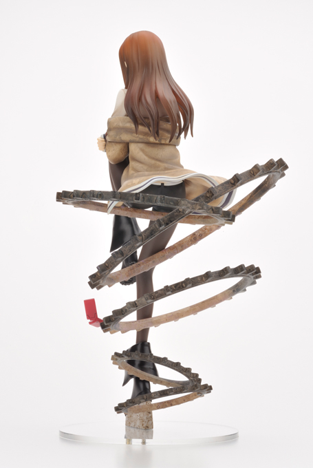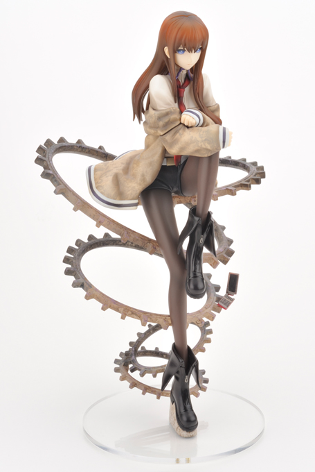 Cette sculpture à échelle 1/8 et d'une hauteur de 24cm se base sur une célèbre illustration du jeu pour proposer une Makise assise, pensive, sur des rouages symbolisant le temps et où flotte également son téléphone portable si important dans l'oeuvre.