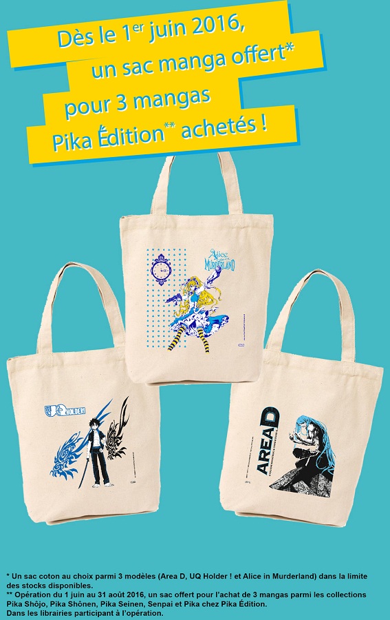 Ainsi, du 1er juin au 31 août, pour 3 mangas achetés, un sac parmi 3 modèles différents vous sera remis par votre libraire s'il participe à l'opération.