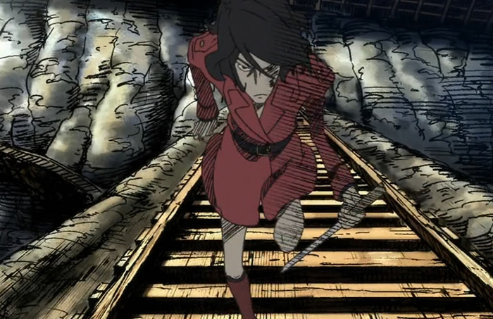 Reste que Zenigata, Oscar, Jigen et Goemon ne sont bien ici que des personnages secondaires, ayant un rôle plus ou moins fort et mis en avant selon les épisodes. Et que Lupin, bien que très présent, et lui aussi beaucoup moins mis en avant qu'une Fujiko qui est bel et bien la vedette de ce spin-off. Au fil des épisodes, on voit l'équipe de la série capter avec brio tout ce qui fait le charme et l'ambivalence de cette insaisissable femme, tour à tour voleuse habile, fine manipulatrice usant de la parole ou de ses charmes fous pour arriver à ses fins, femme forte capable de se sortir de bien des situations, personnage aux multiples facettes capable de prendre bien des visages et de duper quiconque lui ferait trop confiance... et, surtout, figure fascinante de femme forte, prenant un plaisir fou dans ses ébats, dans ses vols audacieux, dans sa soif jouissive de se mettre en danger pour se sentir vivre... On devine chez la Fujiko de cette série une certaine fuite vers l'autodestruction,comme si elle voulait fuir quelque chose... chose que l'on cerne petit à petit à travers, ça et là, des indices sur son passé traumatisant, passé qui se concrétise petit à petit pour finalement occuper l'essentiel des deux derniers épisodes. Des traumatismes d'enfance qui expliquent assez facilement la soif de liberté et la libération sexuelle qu'affiche la belle. Et pourtant, il ne faut pas forcément attendre grand-chose de tout ce travail autour de Fujiko, car après nous avoir laissé au fil des épisodes nombre d'indices, de brefs flashbacks glauques expliquant sans jamais trop en dire les traumatismes ayant forgé la Fujiko adulte, l'épisode final choisit d'être beaucoup plus explicite, quitte à déconstruire une partie de ce que les épisodes précédents nous laissaient voir. Comme si Fujiko, éternellement, devait rester une femme impossible à cerner entièrement... Après tout, cette part de mystère, ce côté insaisissable, c'est aussi ce qui en a fait une figure inoubliable.