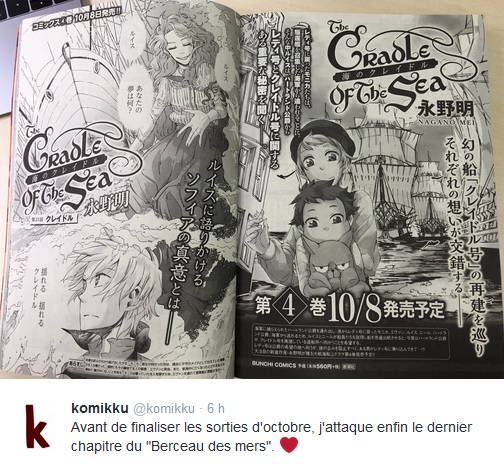 C'est via la page twitter des éditions Komikku que nous apprenons la publication du dernier chapitre de la série Le berceau des mers de Mei Nagano.