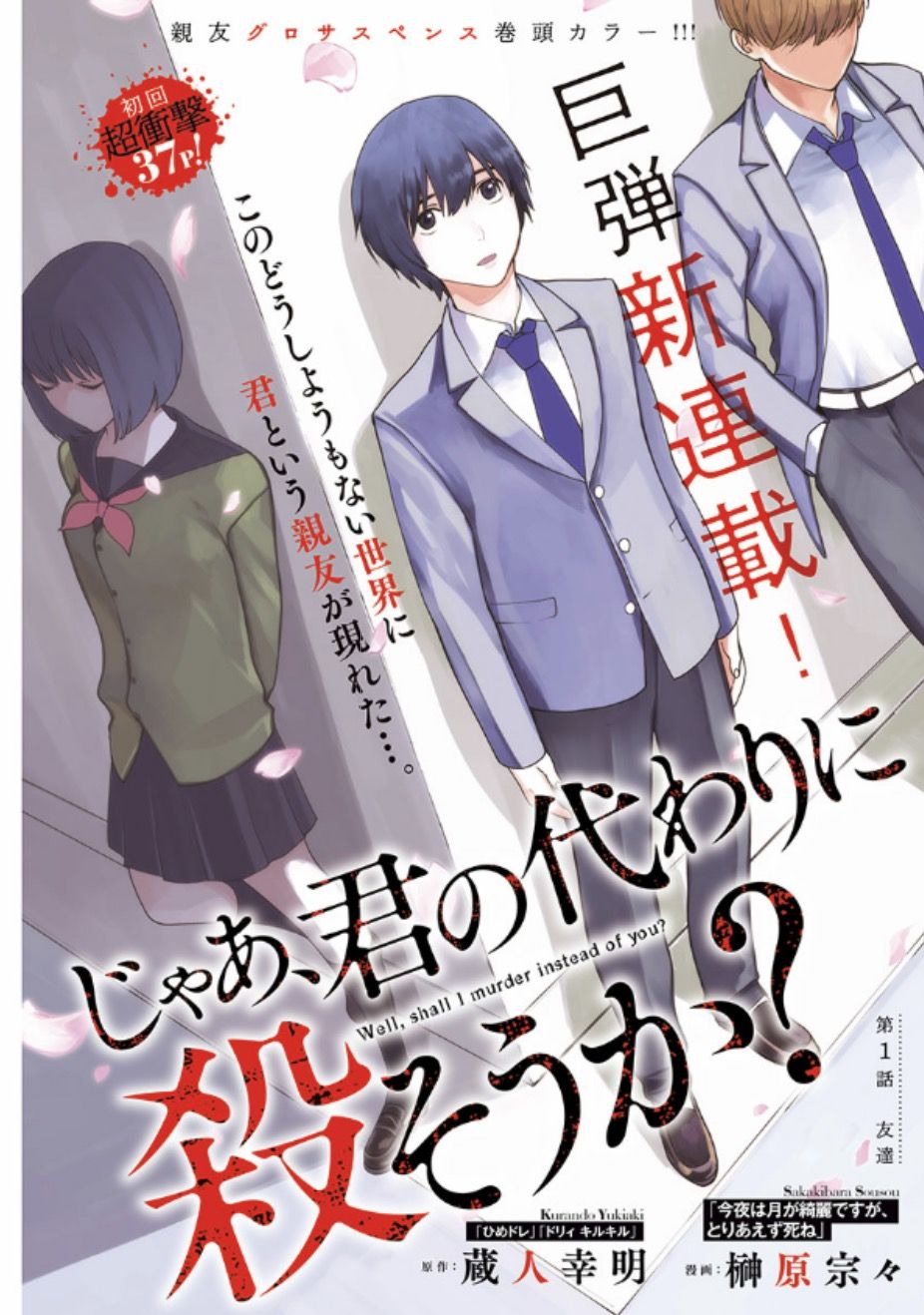 Le titre, intitulé Kimi no Kawari ni Korosô ka, est un seinen prépublié dans le magazine Young Champion des éditions Akita Shoten. A noter que Sôsô Sakakibara ne s'occupe que du dessin, le scénario étant écrit par Yukiaki Kurando, scénariste de Dolly Kill Kill (paru chez nous aux éditions Pika).