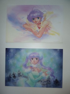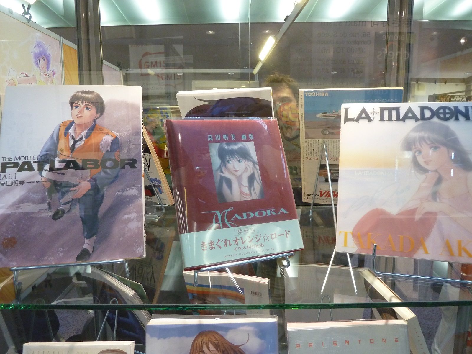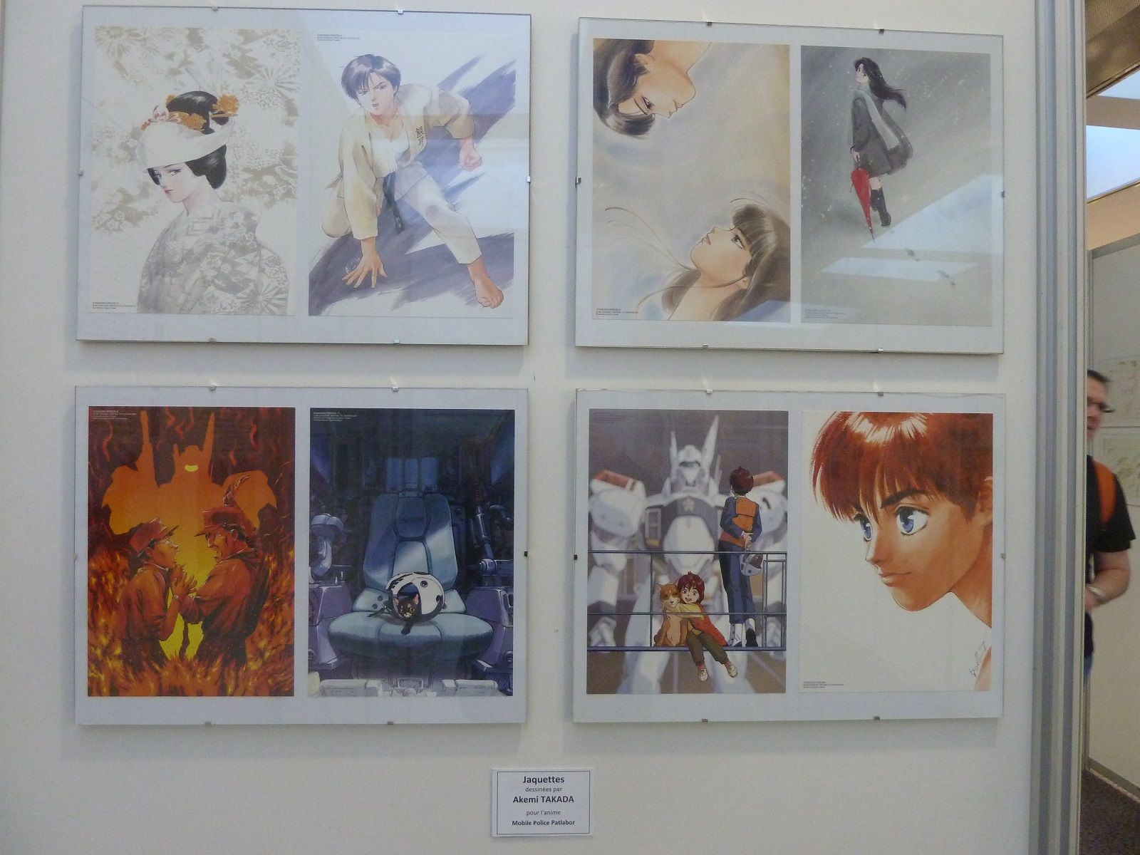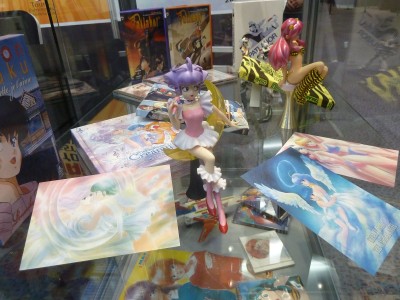 En revanche, le bât blessait un peu sur les travaux visuels, car il y avait en réalité assez peu de choses par rapport au nombre assez étendu des travaux de l'artiste. Malgré tout, la petite sélection avait le mérite d'être assez éclectique, avec des cellulos, des jaquettes, des peintures, quelques croquis, des illustrations de différents styles... A cela, on pouvait ajouter, à côté de l'espace de dédicaces d'Akemi Takada, des vitrines regroupant divers goodies: DVDs, figurines, pochettes, artbooks, magazines, CDs, vinyles... dont plusieurs sont difficiles à trouver aujourd'hui.