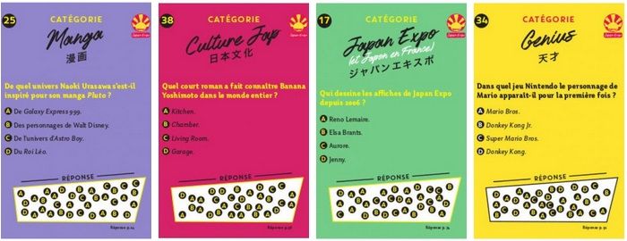 Vendu 12€, Japan Expo Quiz regroupera 300 questions dans 6 catégories : manga, anime, jeux vidéo, culture japonaise, Japan Expo, et Genius. Son déroulement s'appuiera sur le modèle des des stamp rallys, ces jeux très populaires au Japon où l’on doit récolter des tampons pour gagner des cadeaux.