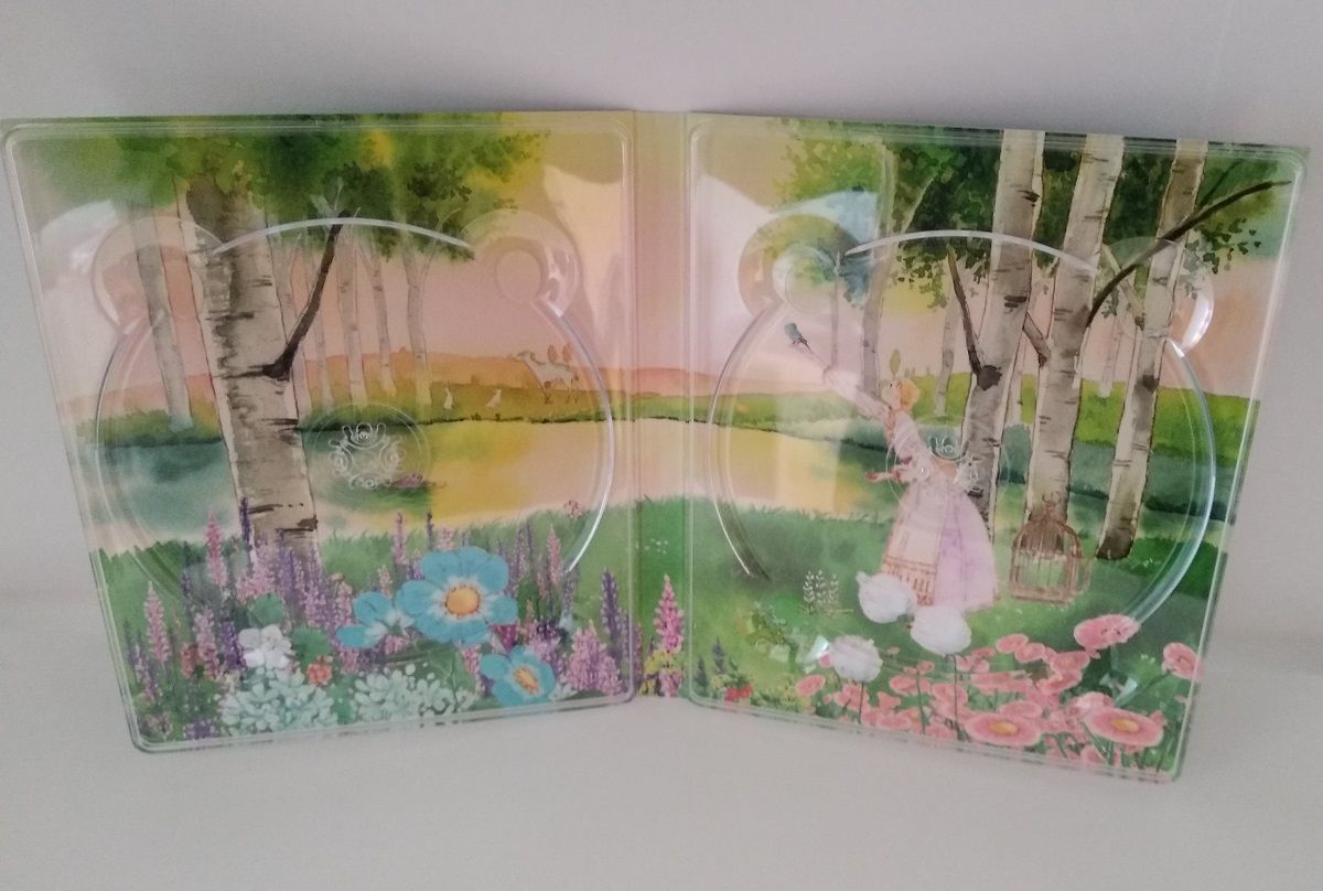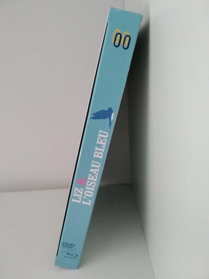 A l'intérieur nous attend, en premier lieu, un digipack à 2 volets, d'allure assez solide, et contenant le film sur les 2 supports DVD et Blu-ray. La sérigraphie des deux disques s'avère très jolie, l'une reprenant l'oiseau bleu et l'autre affichant un décor fleuri du film. Le digipack est lui aussi illustré, bien sûr, et il s'avère très beau. La face extérieure affiche un rendu sobre et aérien, dominé par le bleu ciel et le blanc, où l'on retrouve les silhouettes des deux héroïnes de dos et de l'oiseau dans un ciel ponctué de nuages et avec quelques plumes qui volent. La face intérieure apporte un contraste en se voulant beaucoup plus colorée, reprenant une illustration très fleurie à l'effigie du conte "Liz et l'oiseau bleu", si important dans le film. Des choix intelligents, représentant bien le film, et qui séduisent facilement l'oeil.
