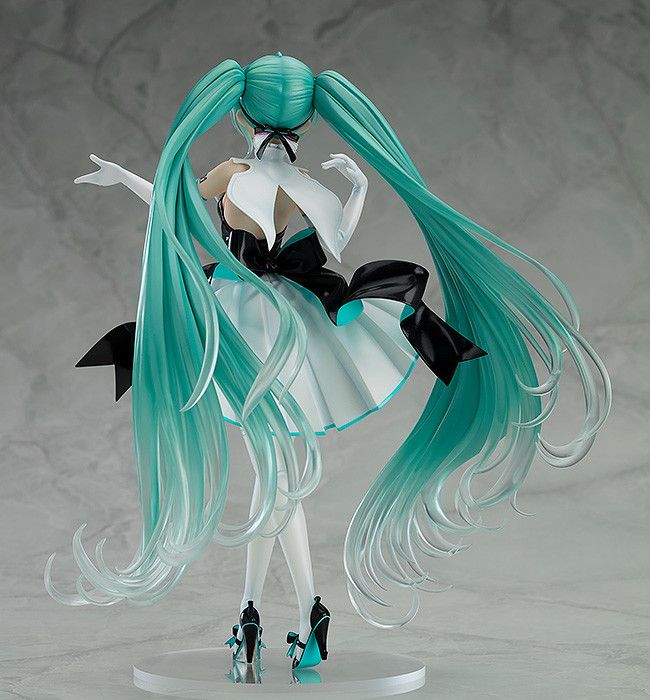 Cette version "Symphony 2019" présente une Miku pure et délicate, vêtue d'une jupe blanche, et inspirée d'une illustration originale de Rella. Les effets perlés de sa tenue et de ses longues couettes lui confèrent une certaine élégance. Elle est conçue en PVC/ABS, est sculptée à échelle 1/8, et fait une hauteur d'environ 21cm.