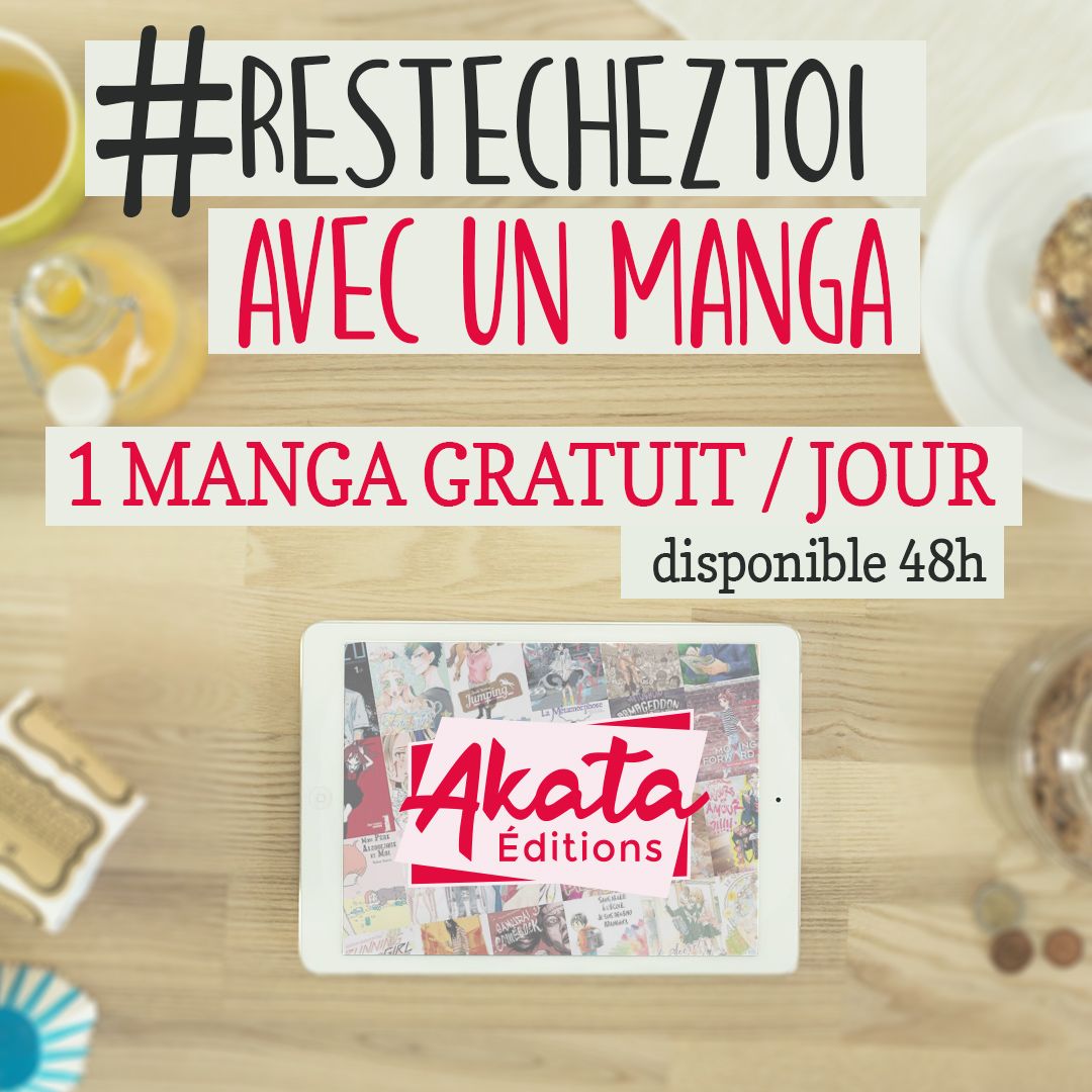 Chez les trois premiers éditeurs, l'opération #ResteChezToi avec un manga se poursuit donc, avec chaque jour un nouveau tome 1 à découvrir ou redécouvrir gratuitement en numérique pour une durée de 48h. Côté heures, la mise en ligne est toujours pour 9h chez Glénat, pour 12h chez Akata, et pour 14h30 chez Pika.