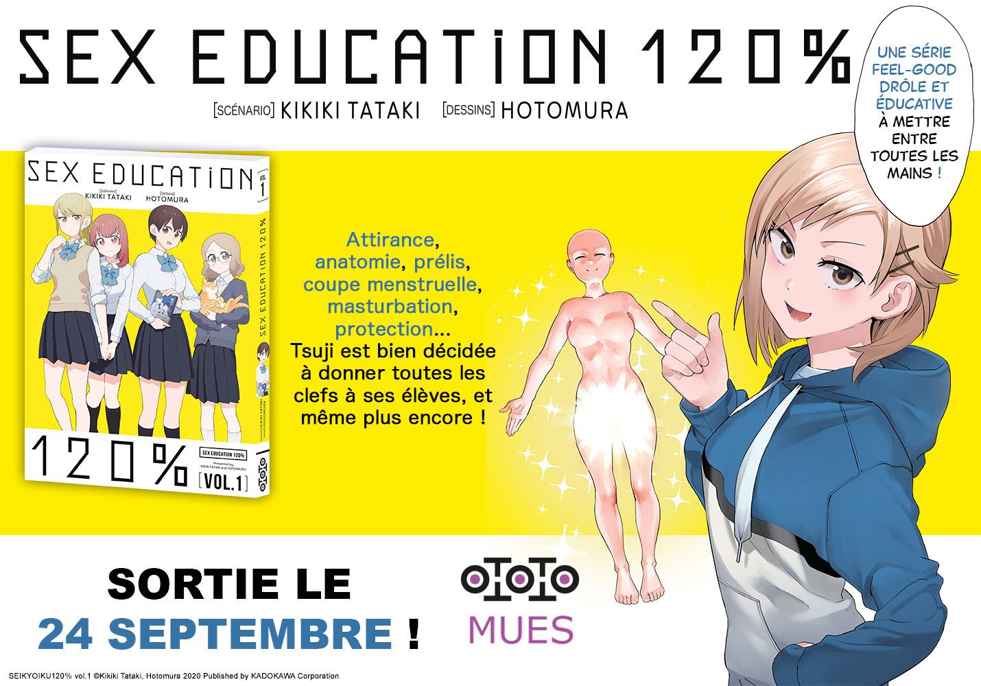 Dès le 24 septembre, au prix de 9,90€ et en format 15x21cm, on pourra découvrir le premier tome de Sex Education 120 %, une série bouclée en 3 volumes, signée Kikiki Takaki (scénario) et Hotomura (dessin), et qui fut prépubliée au Japon en 2020 dans le magazine numérique @ Vitamin de l'éditeur ASCII Mediaworks.
