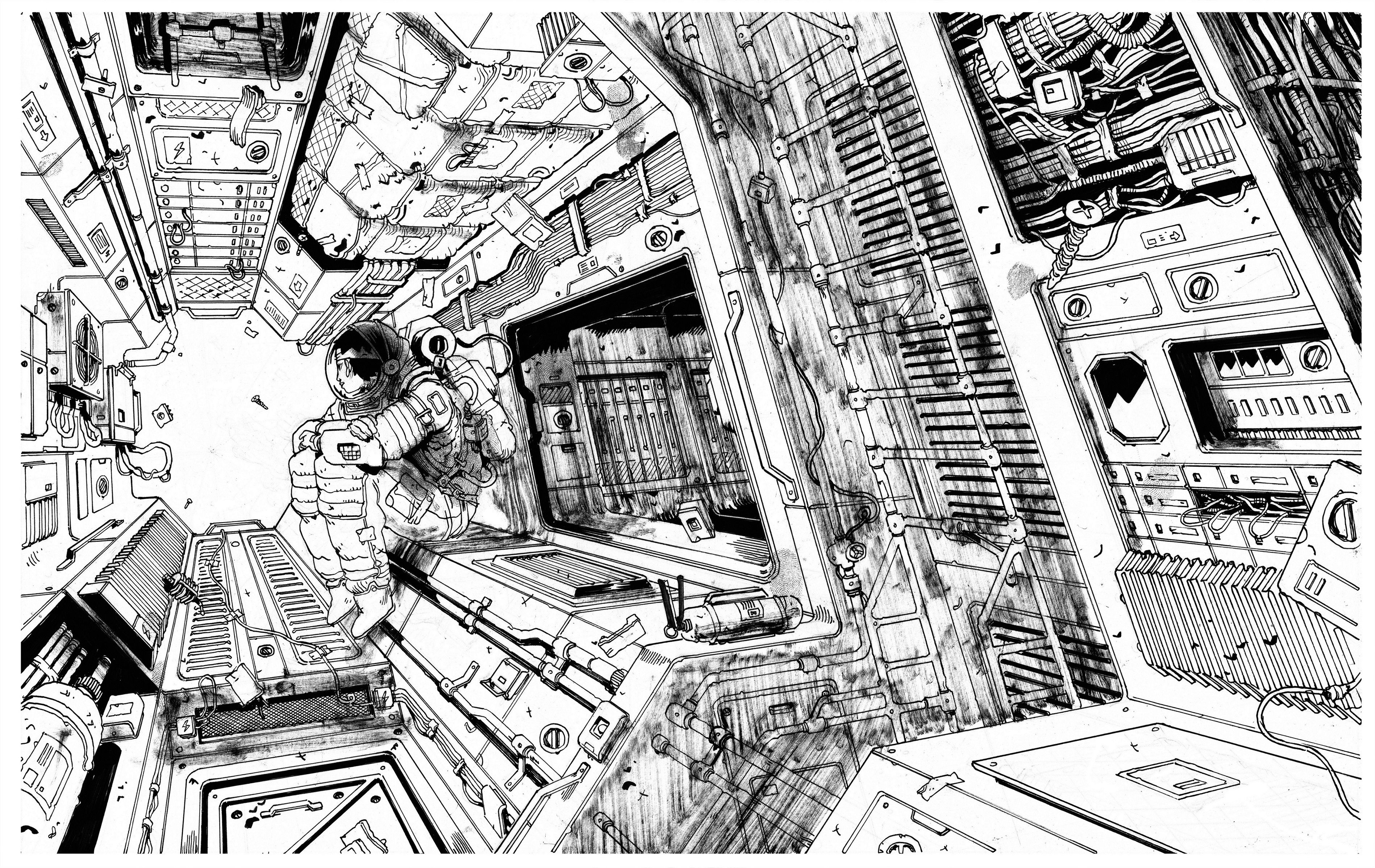 "Nous suivons Bablet depuis Adrastée et avons toujours été autant admiratifs de sa maîtrise du dessin (ses couleurs !) que de son brillant imaginaire nourri d'influences multiples, de la France au Japon, de la BD américaine au cinéma d'animation, etc. Après la relecture de Shangri-La et l'interview donnée par l'auteur sur @FirstPrintFRA où il mentionne Planètes, il nous semblait du coup évident de mettre en route une collaboration pour rendre hommage au travail de Makoto Yukimura de la plus belle des manières. Par chance, les étoiles se sont alignées et nous avons eu l'accord des ayant-droits comme de Mathieu Bablet pour commencer ce projet. Nous avons très vite reçu trois propositions de dessin, toutes magnifiques, dont une pour laquelle nous avons eu un coup de cœur immédiat. Vous pourrez vous rendre compte du génie de Mathieu Bablet à travers ses étapes préparatoires (qu'il nous a gentiment partagé) où le décor fourmille de détails. Du crayonné à la version couleur définitive, chaque étape est magnifique et offre une vision différente de la scène".