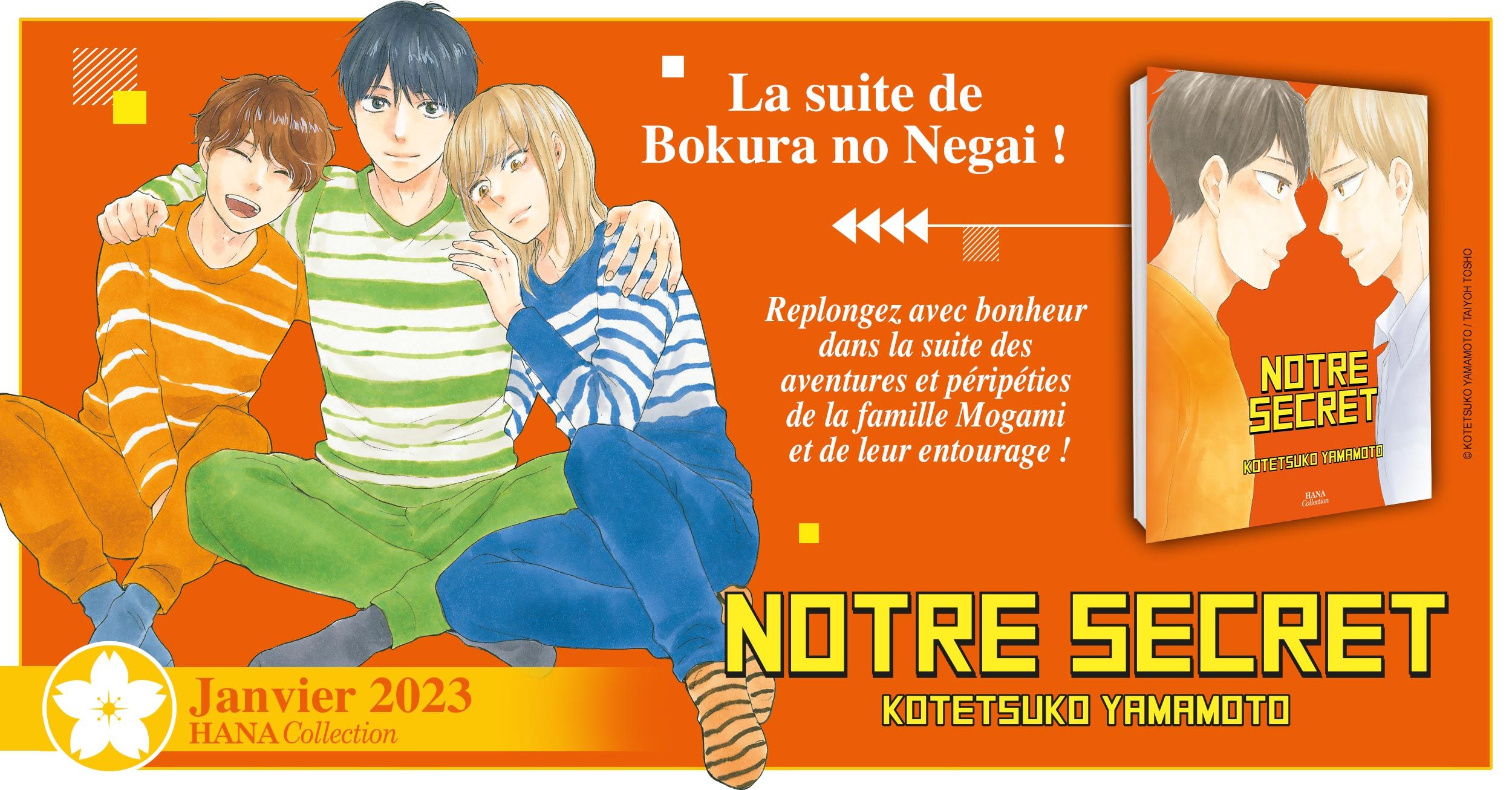 Prépublié au Japon en 2021 dans le magazine Craft de Taiyô Tosho sous le nom Bokura no Himitsu, ce one-shot est une oeuvre de la très prolifique Kotetsuko Yamamoto, autrice incontournable du genre qui a déjà à son actif de nombreuses publications françaises. La famille Mogami vous attend avec de nouvelles aventures dans cette suite du manga Bokura no Negai.