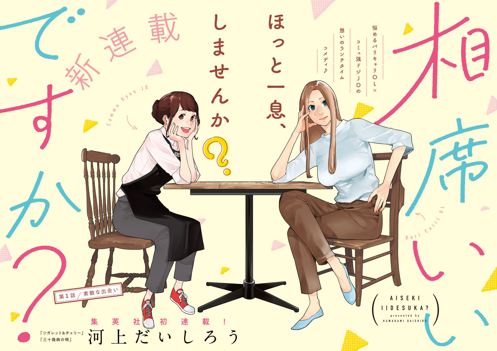 Nommé Aiseki ii desu ka? (ou "Puis-je m'asseoir à votre table ?"), ce nouveau titre a débuté hier dans le 50e numéro de l'année du magazine Young Jump de l'éditeur Shûeisha. L'histoire est celle d'une employée de bureau débordée par son travail, et d'une étudiante maladroite. Toutes deux se retrouvent lors de pauses déjeuner, véritable oasis moderne pour les personnes trop occupées dans leurs quotidiens.