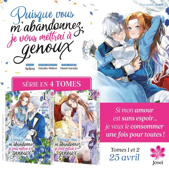 Les éditions Meian ont annoncé ce midi l'acquisition du manga en quatre tomes Puisque vous m'abandonnez, je vous mettrai à genoux, une histoire de vengeance passionnelle et érotique qui est réservée à un public averti (16 ans et plus).