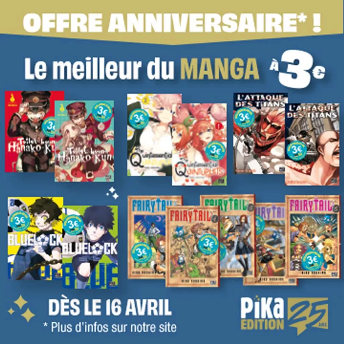 Une nouvelle offre sera lancée en librairies par les éditions Pika le 16 avril pour célébrer leur 25e anniversaire: pour tout le reste de cette année 2025, les premiers tomes de certaines séries de leur catalogue seront proposés au tarif réduit de 3€ !