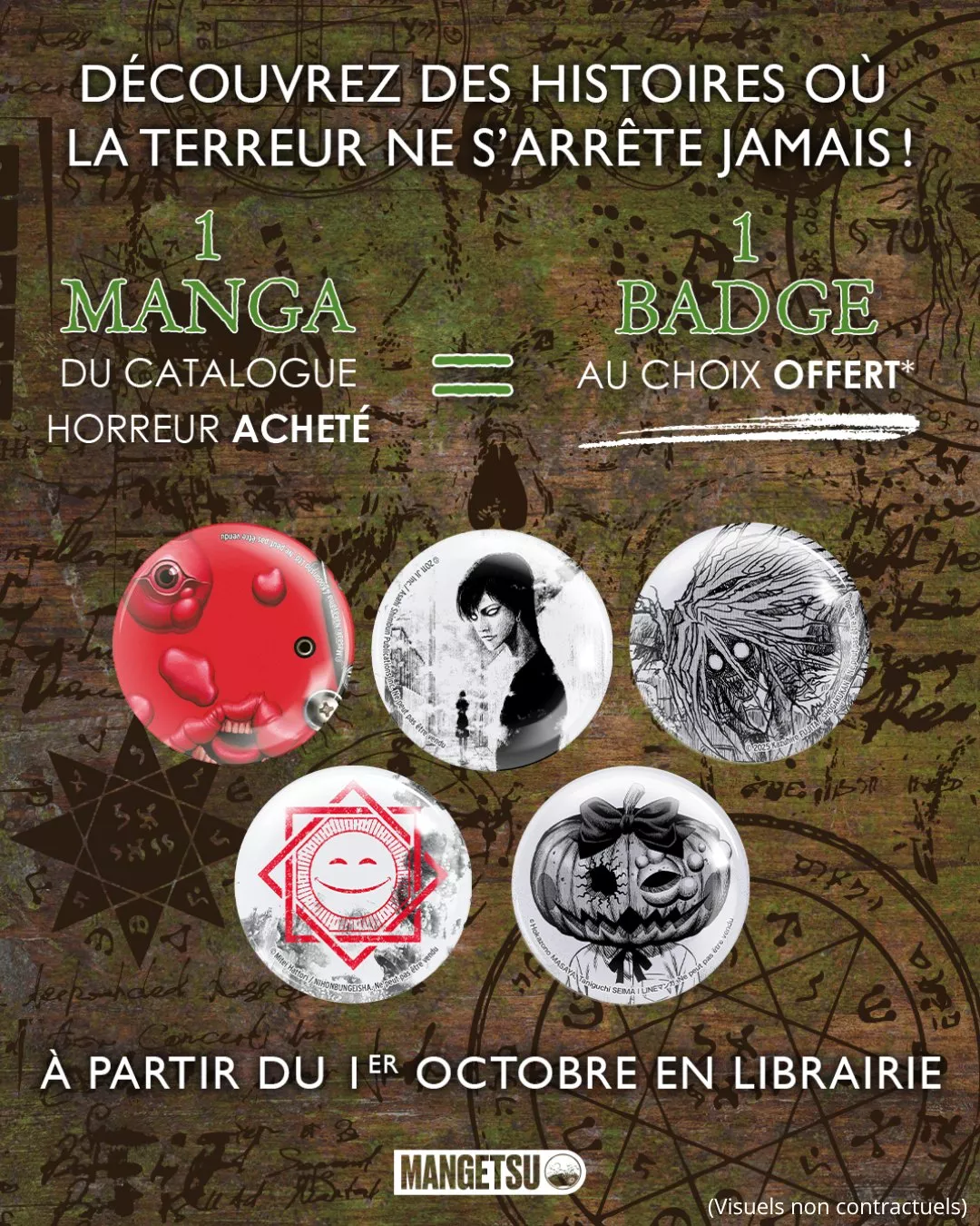 En effet, pour l'achat d'un manga du catalogue horreur de l'éditeur, vous pourrez repartir avec un badge parmi cinq modèles au choix.
