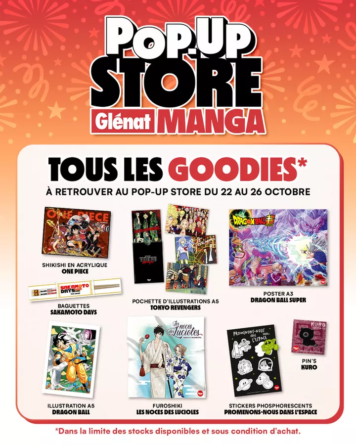 Nous vous en parlions le mois dernier (lire notre news) : du 22 au 26 octobre, les éditions Glénat embelliront la capitale parisienne avec un pop-up store ! A l'approche de l'événement, les goodies distribués sur places ont été dévoilés !