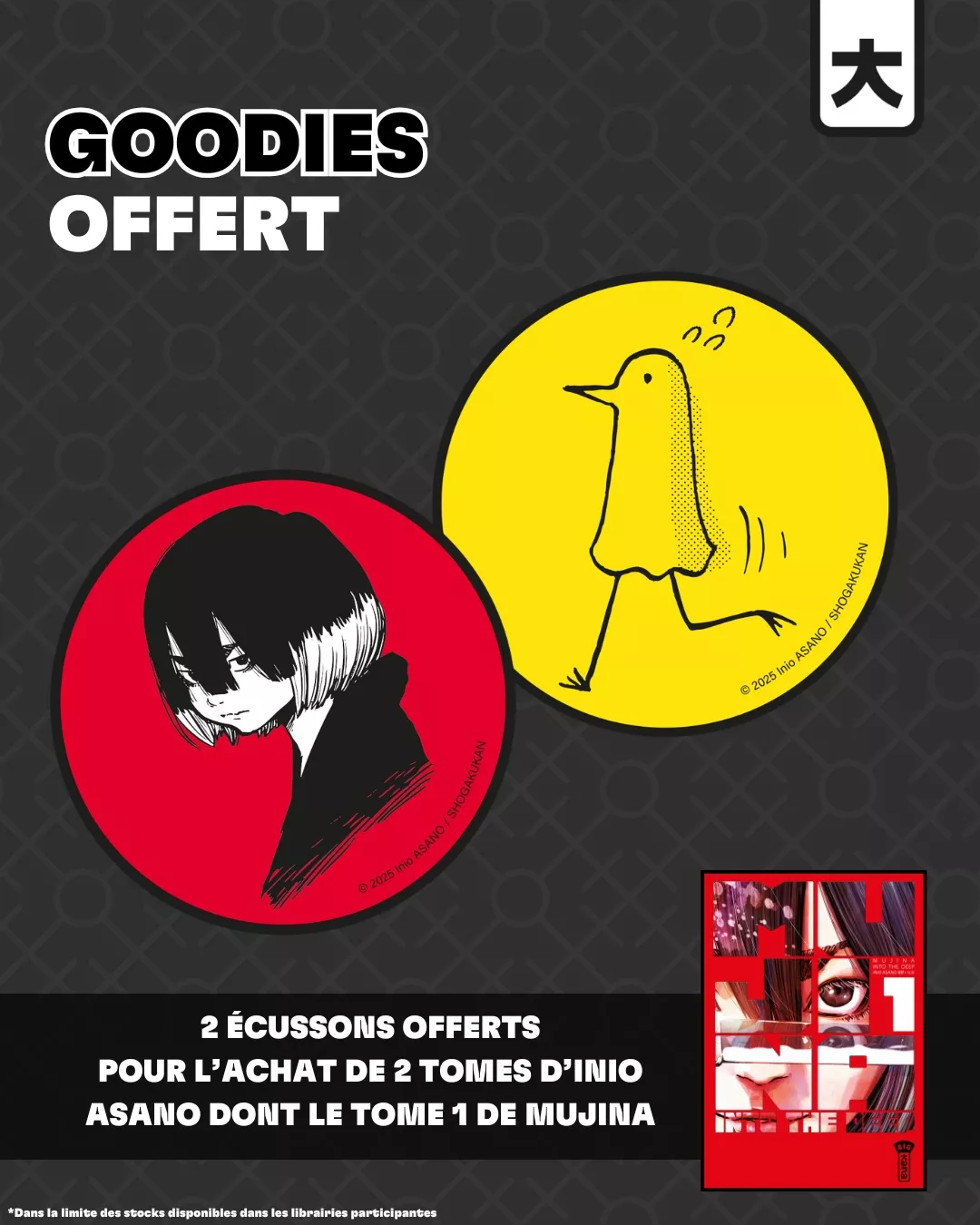 En effet, pour l'achat du premier volume de cette nouvelle oeuvre, vous pourrez repartir avec deux écussons offerts: l'un à l'effigie de Mujina, et l'autre mettant à l'honneur Punpun. L'offre sera valable dans la limite des stocks disponibles, sur la boutique en ligne de l'éditeur et au sein des librairies participantes. pour savoir si votre librairie participera, vus pouvez la contacter.