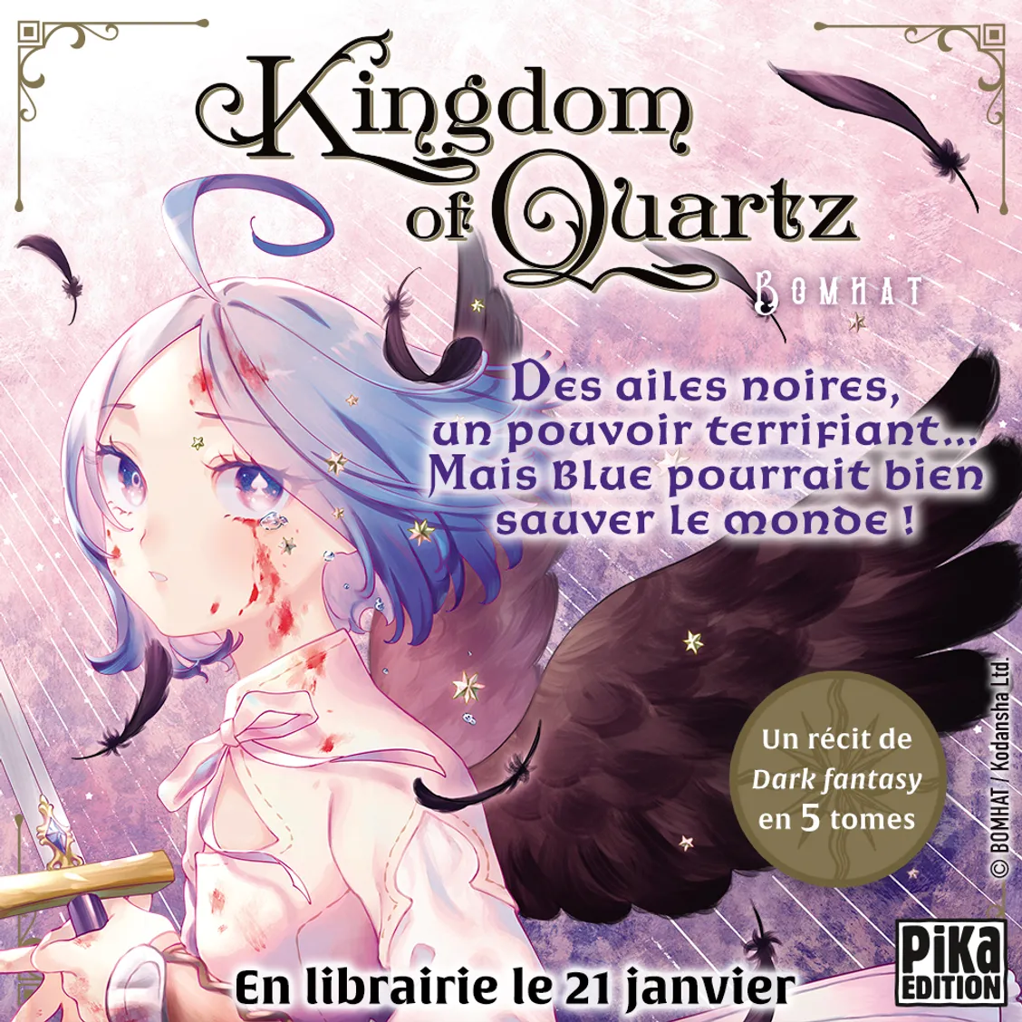 Les éditions Pika ont annoncé l'arrivée dans leur collection seinen du manga en cinq tomes Kingdom of Quartz, dont le premier tome est prévu en librairies le 21 janvier 2026 au prix de 7,70€. La série sera également disponible en numérique, et sera traduite par Oriane Faulhaber.
