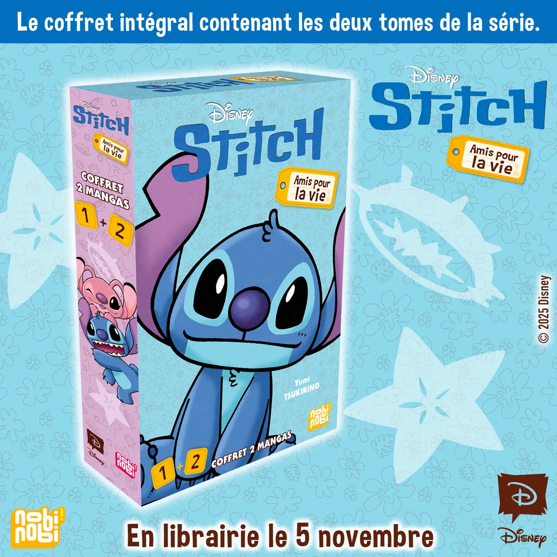 Initialement paru en France chez nobi nobi! l'année dernière, le manga en deux tomes Stitch - Amis pour la vie va revenir, à l'occasion des fêtes de fin d'année, sous la forme d'un coffret dont la sortie est prévue le 5 novembre. Celui-ci réunira les deux volumes pour un prix de 15€, soit le même tarif que l'achat des tomes à l'unité.