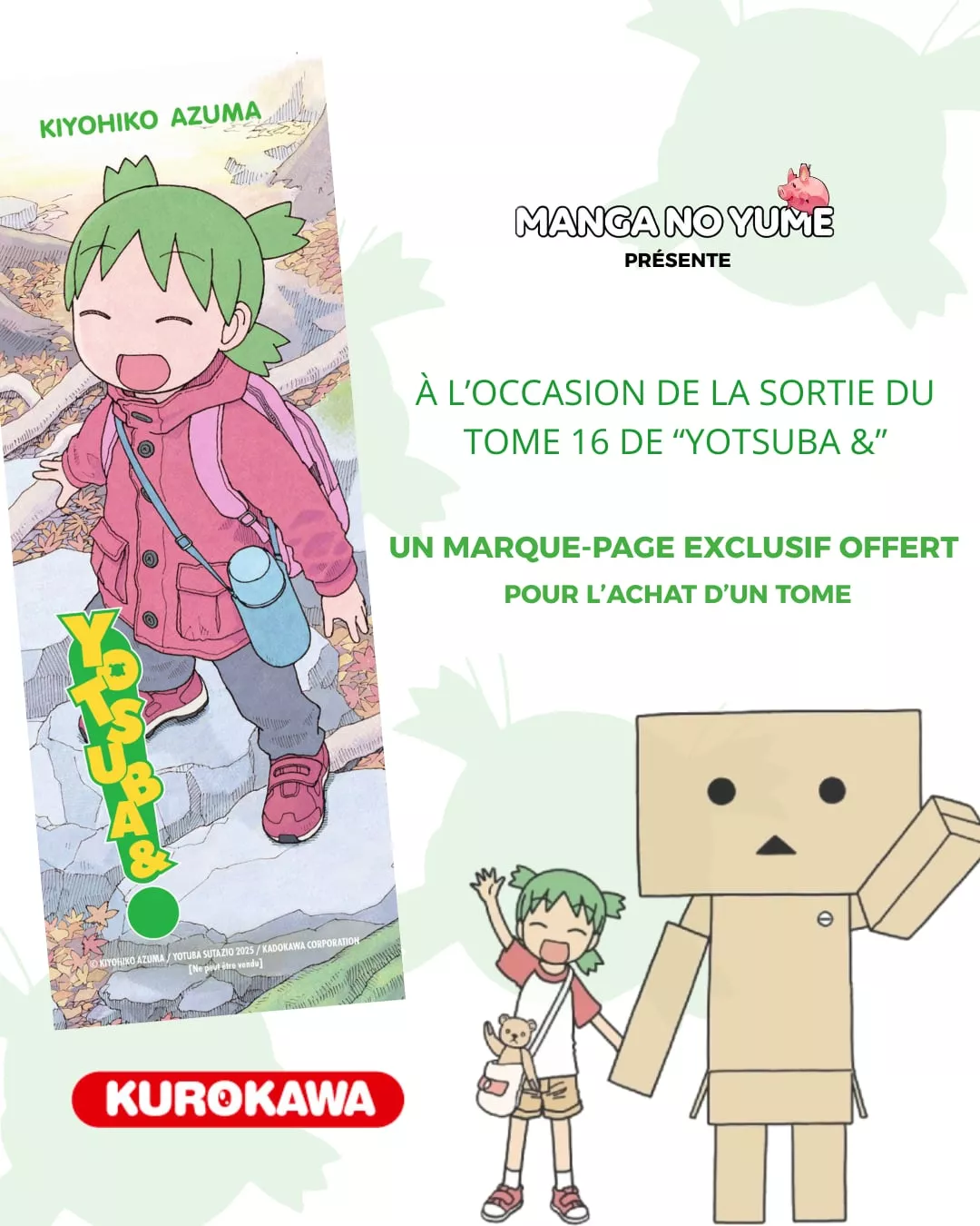 Depuis quelques jours, à l'occasion de la sortie en France du tome 16 de Yotsuba&! chez Kurokawa, la librairie lilloise Manga no Yume propose une jolie petite exclusivité aux fans de l'oeuvre culte de Kiyohiko Azuma: un marque-page reprenant l'illustration de la jaquette, offert à l'achat d'un volume dans la limite du stock disponible.