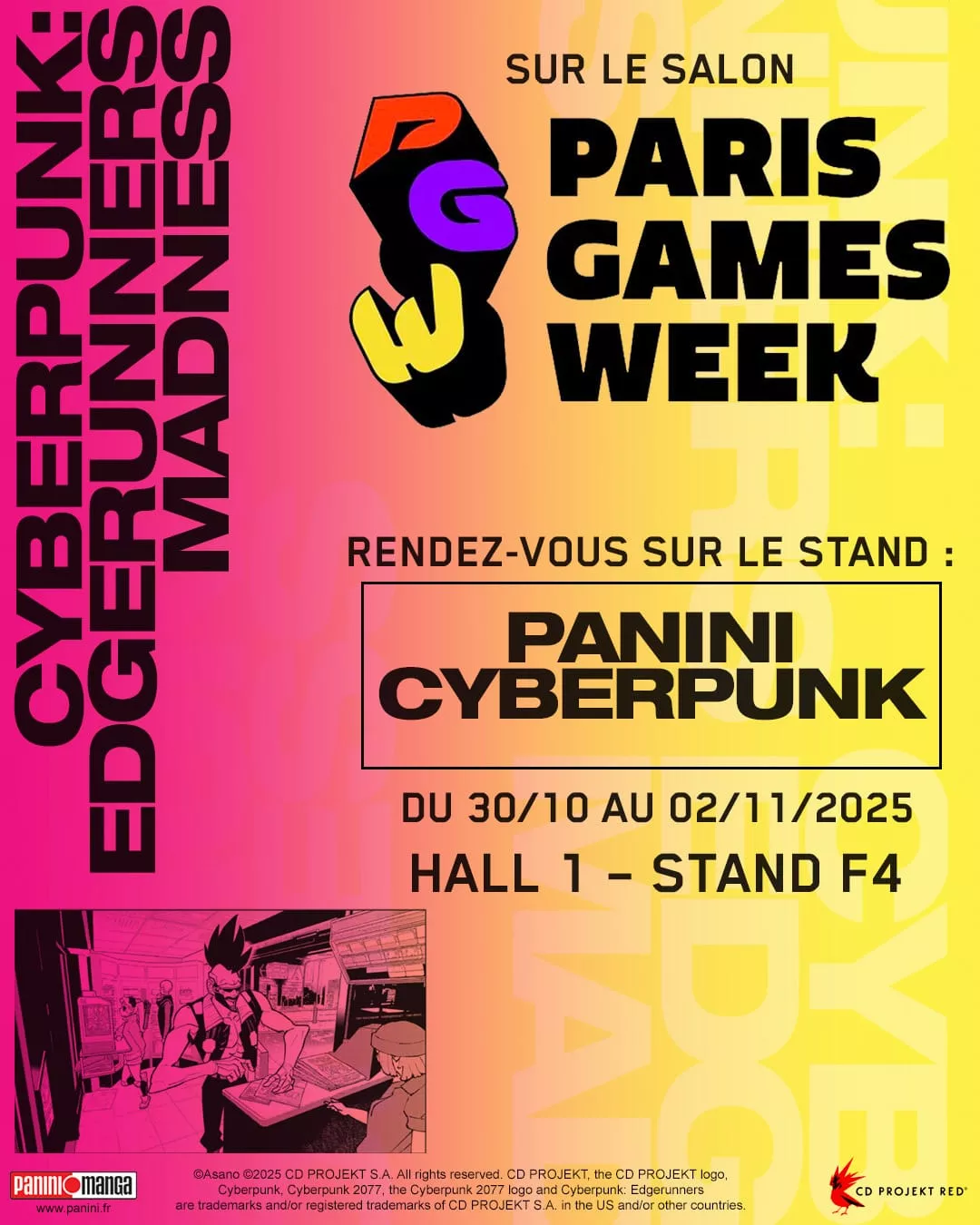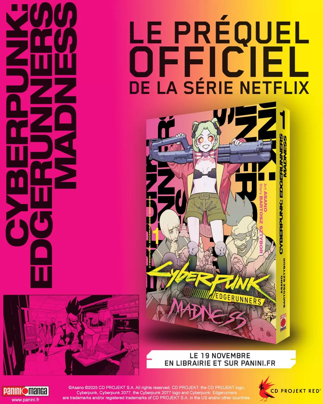 Lancé en France en prépublication numérique par Panini en décembre dernier dans la foulée de ses débuts au Japon, le manga Cyberpunk : Edgerunners MADNESS fut ensuite confirmé par l'éditeur pour une parution en version papier qui devait initialement débuter en septembre. C'est finalement un peu plus tard que l'oeuvre verra son premier tome paraître dans notre pays, mais avec une date qui est désormais sûre: le 19 novembre, au prix de 8,29€.