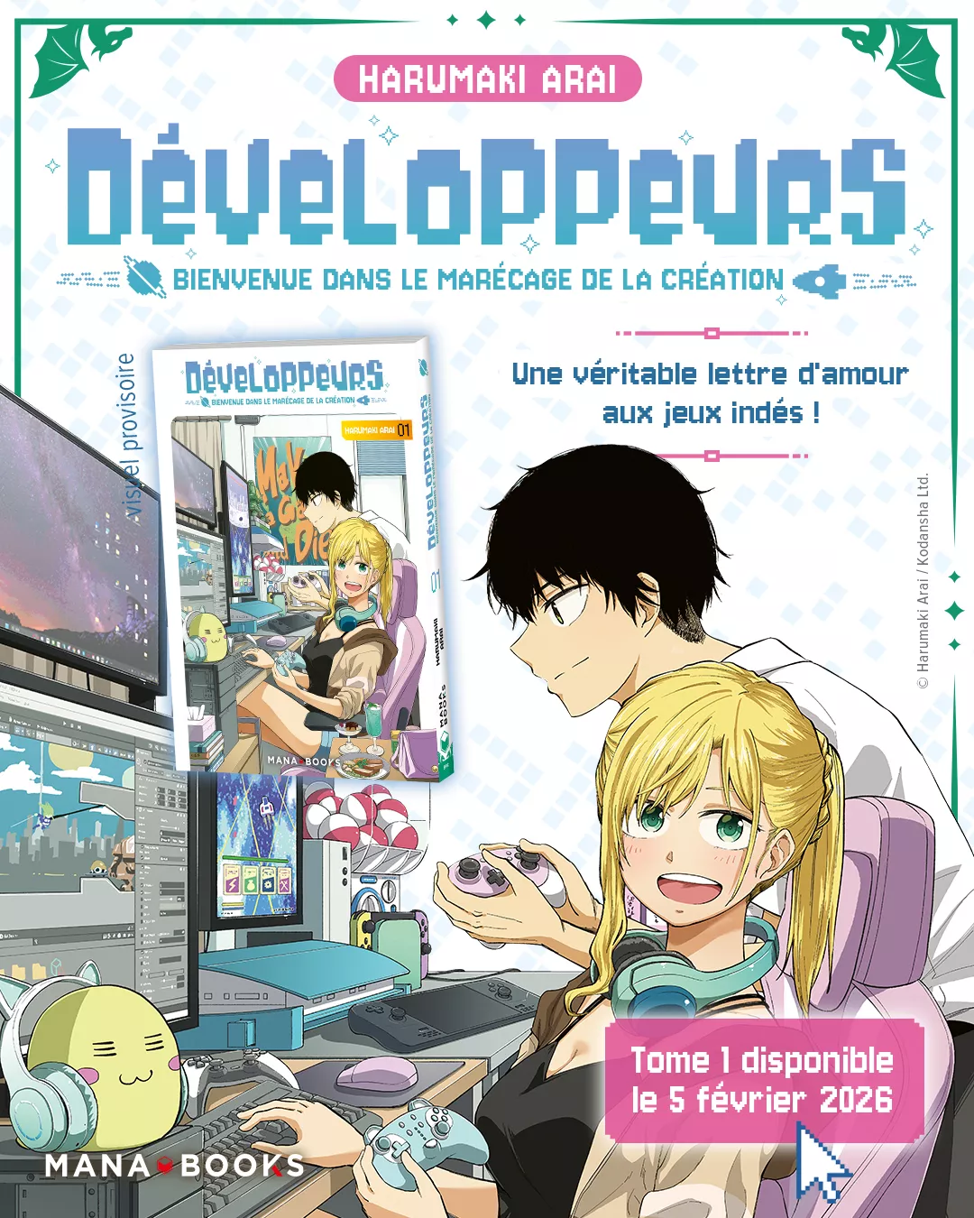 Les éditions Mana Books ont annoncé l'arrivée dans leur catalogue du manga Développeurs - Bienvenue dans le marécage de la création, dont le premier tome est prévu dans la collection EPIC le 5 février 2026 au prix de 7,95€.