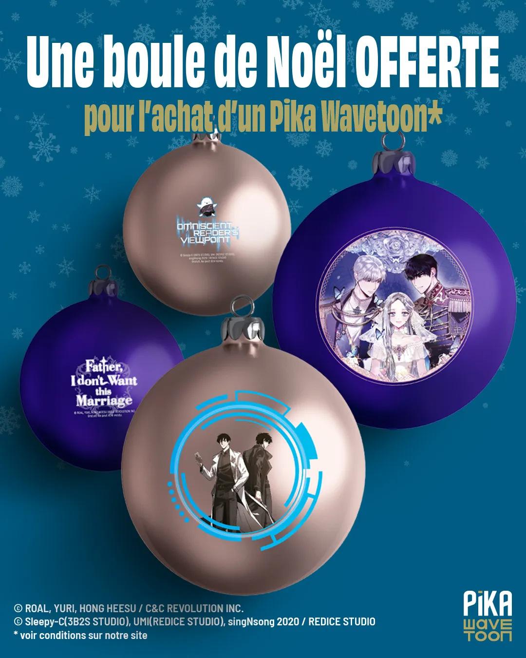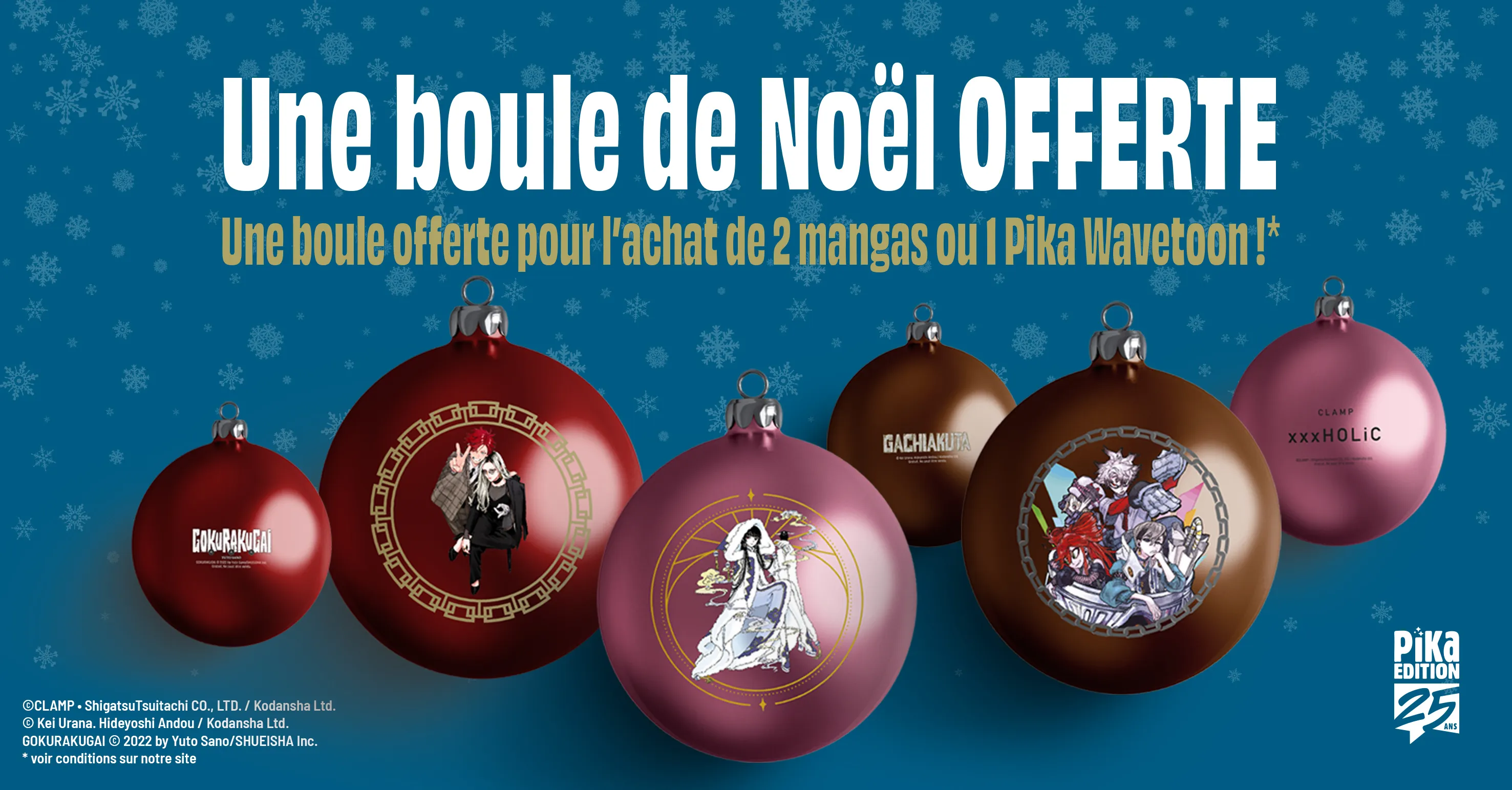 A l'approche de la fin de l'année, les éditions Pika et leur label jeunesse nobi nobi! vont relancer leur opération Noël: dès le 5 novembre, pour l'achat de deux mangas ou d'un webtoon de ces deux éditeurs, vous pourrez repartir avec une boule de Noël parmi six modèles.