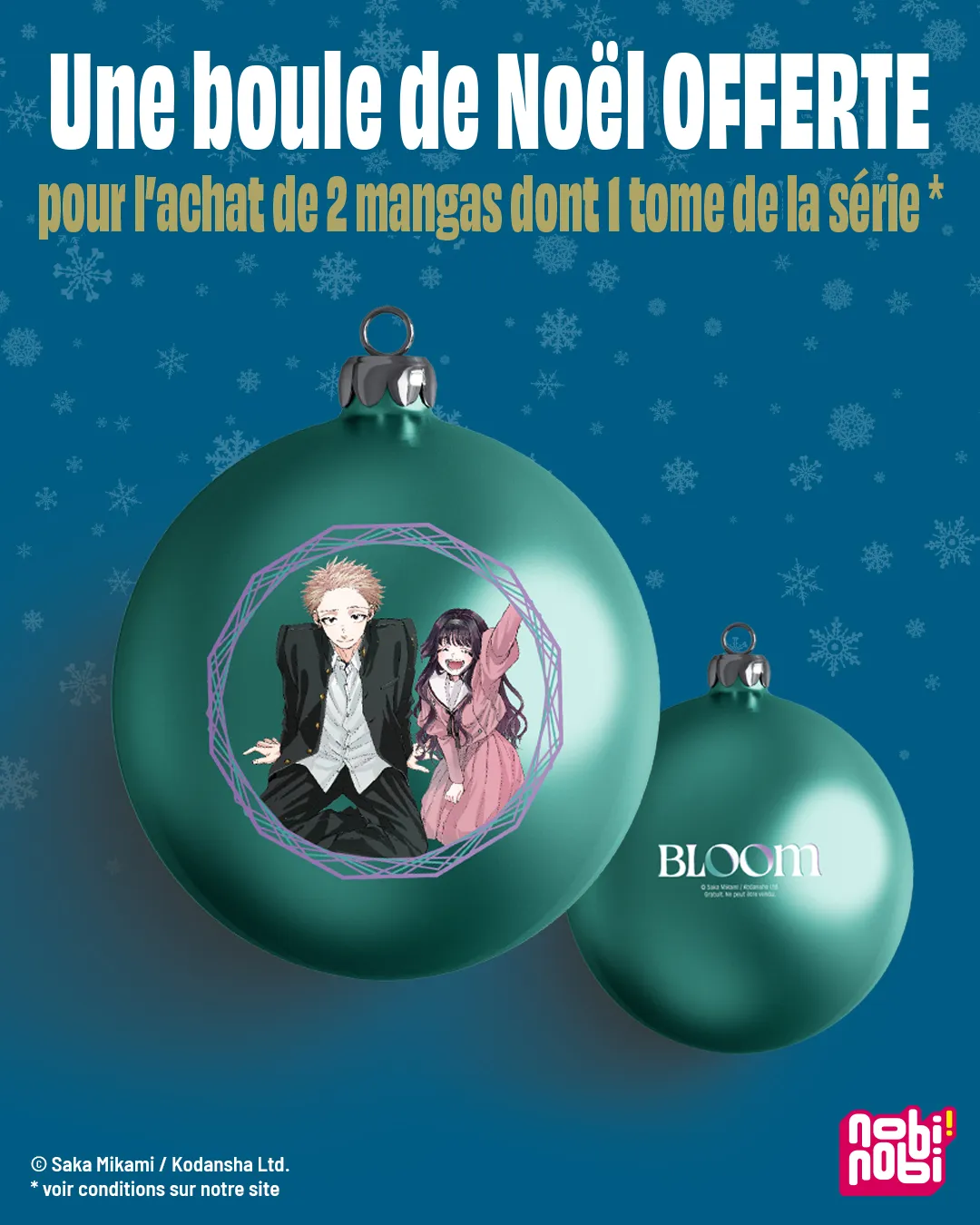 Une boule de Noël Bloom pour l’achat de 2 mangas publiés par nobi nobi ! dont au moins un exemplaire de la série Bloom et un autre manga publié originellement au Japon par Kodansha.
