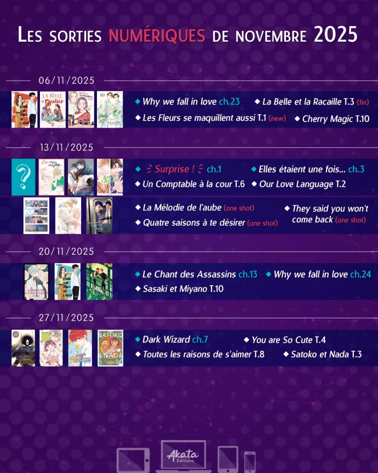 Les éditions Akata ont dévoilé leur planning de parutions numériques du mois de novembre, un mois fortement placé sous le signe des mangas LGBT+, entre la fin du yuri La Belle et la Racaille, le début d'un autre avec Les Fleurs se maquillent aussi, et l'arrivée de nouveaux one shots boy's love.