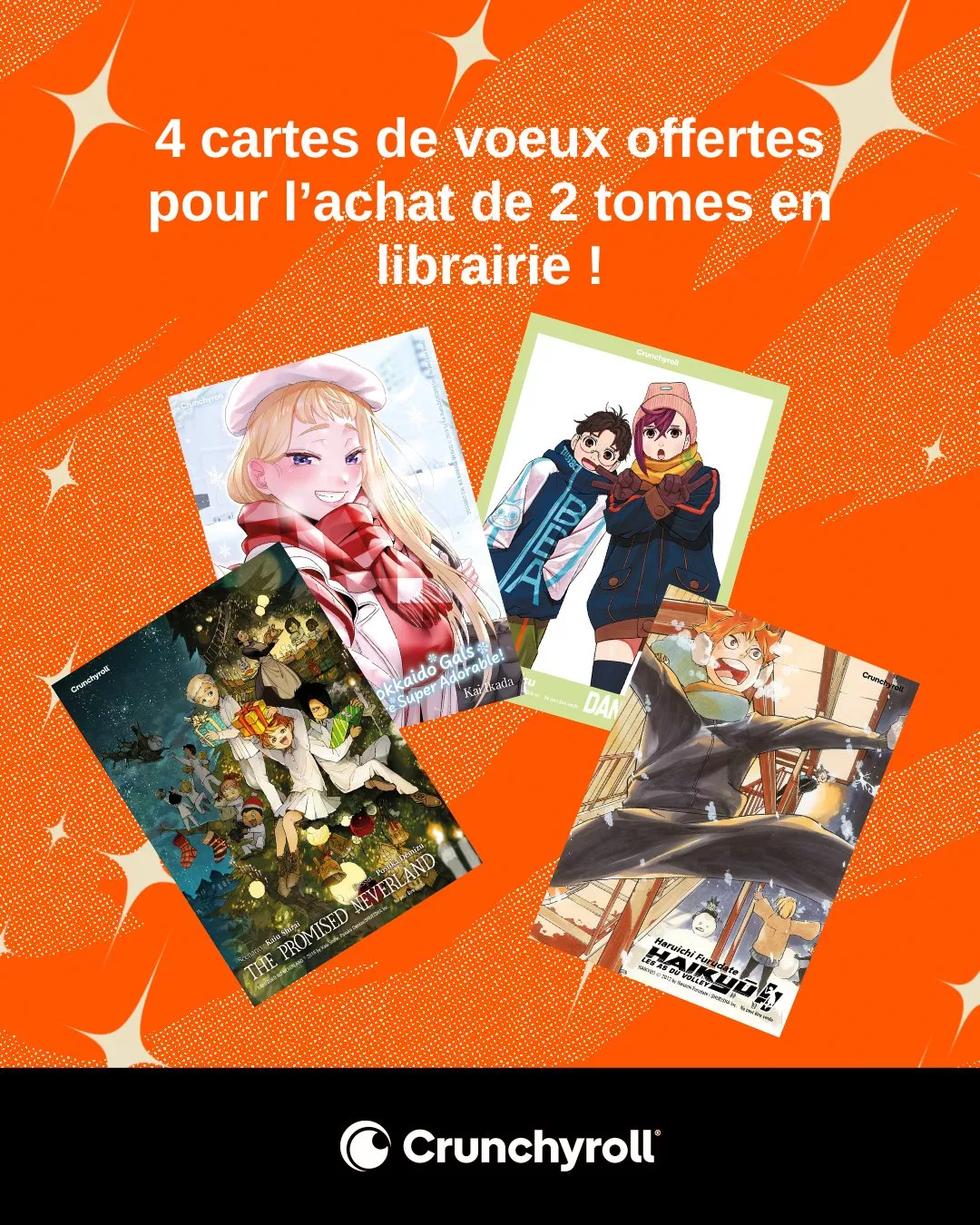 En effet, un set de quatre cartes postales vous sera offert à l'achat de deux volumes des quatre séries concernées, à savoir Dandadan, Hokkaido Gals Are Super Adorable!, The Promised Neverland et Haikyû!!.