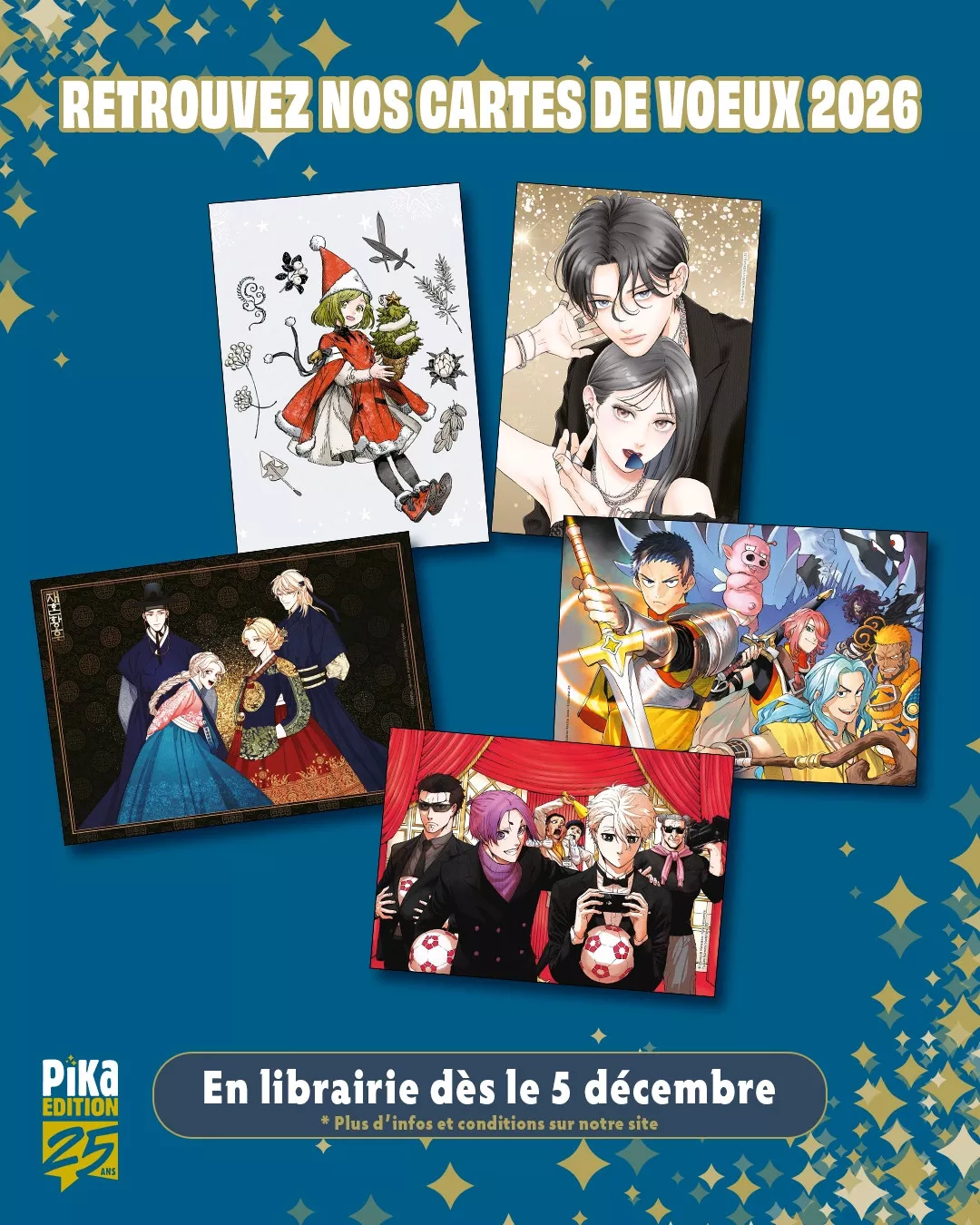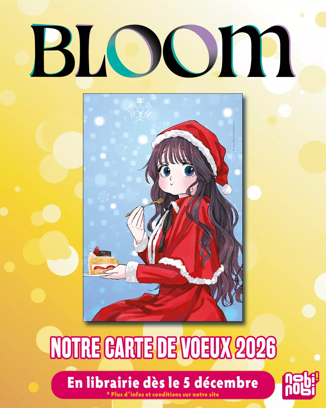 Ce 5 décembre, les éditions Pika et leur label jeunesse nobi nobi! réitèrent leur offre de cartes de voeux offertes en librairies avec, cette année, six modèles: une carte chez nobi nobi! mettant à l'honneur Bloom, et cinq cartes chez Pika mettant en avant L'impératrice remariée, You Rock Me, Blue Lock - Episode Nagi, Versus, et L'Atelier des Sorciers.