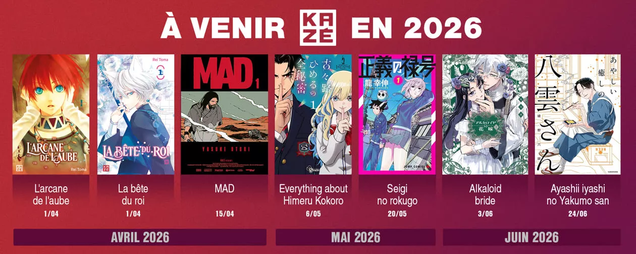 Pour ces différents titres, l'éditeur présente une symbolique : "L'Arcane de l'Aube est dans l'historique de Kaze. MAD fait penser à Fire Punch à l'époque. Seigi no Rokugô explore l'œuvre de l'auteur de Dandadan qui est notre meilleure série du moment. Et le shôjo/josei revient dans notre catalogue, comme avant."